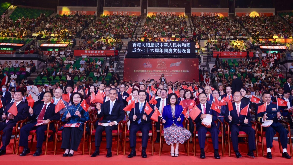 慶祝中華人民共和國成立76周年國慶文藝晚會今晚(2日)於紅磡香港體育館舉行。今年晚會以「紫荊花開 香滿神州」為主題,推出眾多精彩節目。行政長官李家超、全國政協副主席梁振英,以及多名司局長出席。李家超表示,很高興和太太在國慶文藝晚會欣賞眾多精彩文藝表演,一同慶祝祖國繁榮昌盛。