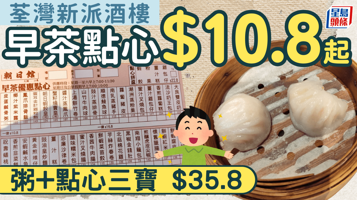 荃灣新派酒樓早茶破底價!$10.8起歎蝦餃/燒賣/盅頭飯 粥+點心三寶$35.8