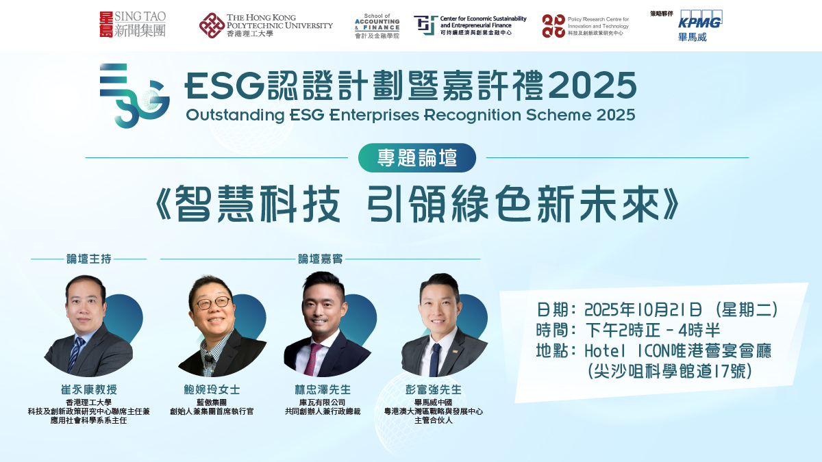 「ESG認證嘉許暨永續發展論壇2025」專題論壇以《智慧科技 引領綠色新未來》為主題,由香港理工大學科技及創新政策研究中心聯席主任兼應用社會科學系系主任崔永康教授擔任嘉賓主持,聯同藍傲集團創始人兼集團首席執行官鮑婉玲女士、庫瓦有限公司共同創辦人兼行政總裁林忠澤先生,以及畢馬威中國粵港澳大灣區戰略與發展中心主管合伙人彭富強先生等三位論壇講者,共同討論香港如何推動綠色金融轉型,及助力大灣區及「一帶一路」實現可持續發展,屆時更會重點討論人工智能技術與未來ESG發展之關係。