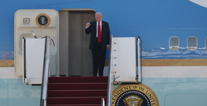 川普总统从“空军一号”机门走出,在号角鸣奏下步下舷梯,并在红地毯上与等候接机的官员一一握手。