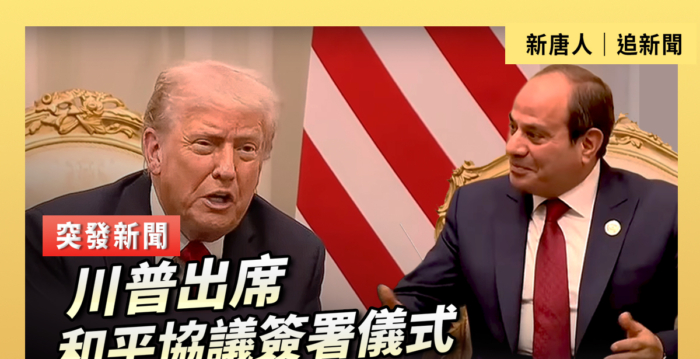 【大纪元2025年10月13日讯】美东时间10月13日上午,美国总统川普(特朗普)将出席在红海海滨度假城市沙姆沙伊赫( Sharm-el-Sheikh)举行的和平协议签署仪式。之后,川普将与埃及总统共同主持加沙和平峰会,新唐人、大纪元进行网络直播(中文即时翻译字幕)。