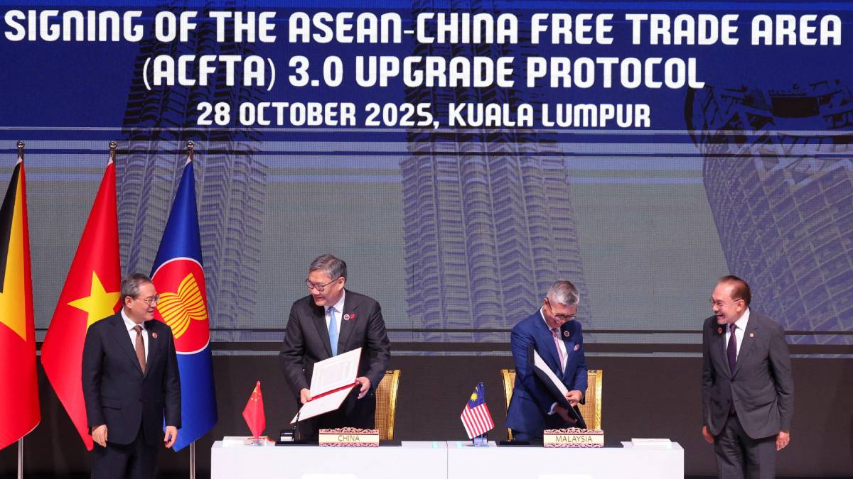中國商務部長王文濤與東盟代表在馬來西亞吉隆坡,簽署自貿區3.0版升級議定書,內容涉及包括數碼經濟、綠色經濟、供應鏈互聯互通等9個領域。中國國務院總理李強及馬來西亞總理安華在場見證簽署。