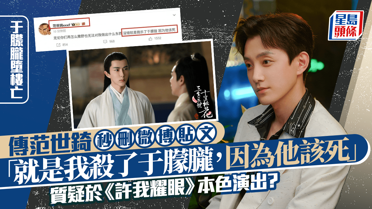 內地劇《太子妃升職記》、《三生三世十里桃花》走紅男星于朦朧,於9月驚傳在北京墮樓身亡消息,終年37歲。歌手范世錡(范世琦)捲入好友于朦朧猝逝爭議,事業受到考驗,日前宣布取消演唱會,更傳出遭品牌切割外,連帶其特別演出的新劇《許我耀眼》,也受到非議。網上近日流傳疑似為范世錡的微博發文:「他該死」,引起網民關注。