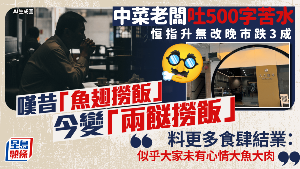 本港飲食業面對租金上漲及消費疲軟的挑戰,出現一波結業潮,香港多間連鎖酒家、老字號,甚至知名食肆大受影響,難逃結業厄運。人氣中菜館「人人和平小飯店」老闆早前於網上官方專頁發文苦呻近年生意大如前,晚市亦變得門可羅雀,就連食肆老闆行家亦問:「啲人去晒邊?」,令他預料飲食業或有更多食肆結業,他亦慨嘆:「要認真考慮前路」。