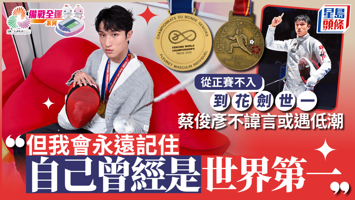 27歲劍擊代表蔡俊彥同樣在今年迎來突破。近4個月內,他橫掃3項大賽(5月上海大獎賽、6月亞錦賽及7月世錦賽)金牌,世界排名由32位飆升至世界第一。他不諱言,知道日後仍會在劍擊路上遇上低潮與瓶頸,「但我會永遠記住這一刻,自己曾經是世界第一,我相信這有助克服之後的種種難關。」