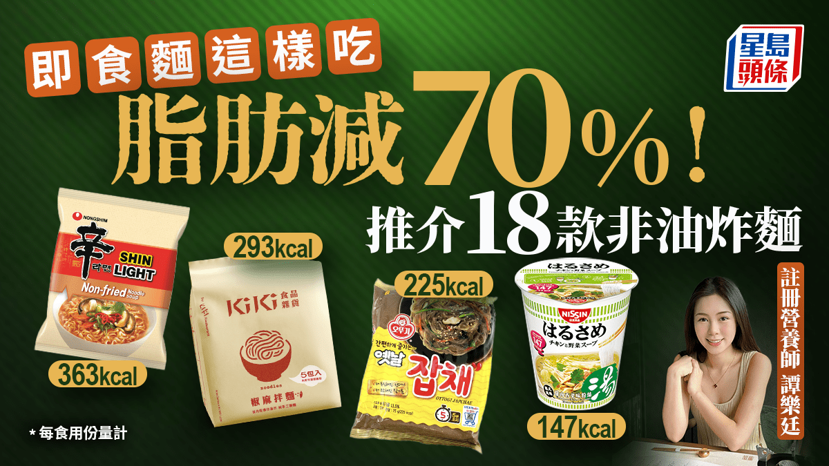 註冊營養師譚樂廷(Audrey)在其instagram發文,推介18款非油炸即食麵,包括大家熟悉的「農心」、「日清」出前一丁等產品。她指出,非油炸即食麵的卡路里、脂肪含量也比油炸即食麵少。