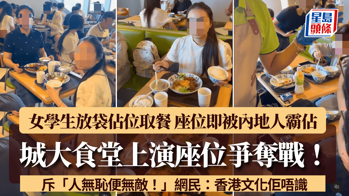 最近一名女學生發文分享在香港城市大學食堂用餐的遭遇,事主表示,當日在食堂找到座位後,將隨身袋放在椅子上,並掃描二維碼點餐,隨後離開座位前往取餐。惟相隔1分鐘後回到座位,卻發現座位被兩名內地人佔用,對方要求事主另覓座位,並表示:「個位冇寫你名」,並稱「唔可以用啲袋嚟霸住個位」,形容態度囂張。職員介入無果,事主唯有尋找另一個座位。對此事主感到憤慨,形容對方「人無恥便無敵」。她補充,由於大學食堂不設送餐服務,學生需自行取餐,短暫離開座位是常見做法。