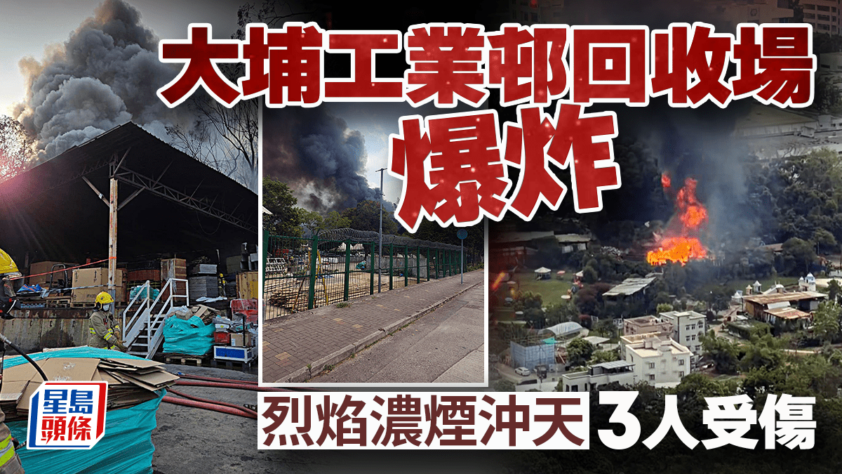 今(26日)晨11時許,大埔汀角路工業邨一間回收場,突然發生爆炸,烈焰濃煙冒出,三名男子走避不及燒傷,消防到場開喉灌救,並調查意外原因。 網上圖片所見,現場火勢猛烈,濃煙席捲半空。據了解,多名報案者報稱聽到多次爆炸聲。 火警中至少有3人受傷,當中包括一名58歲男工人二級燒傷,另一名35歲非華裔男子亦都受傷,他們全被送往威爾斯親王醫院治理。 消防處表示今日上午11時01分接獲報告,指大埔鳳園路附近一