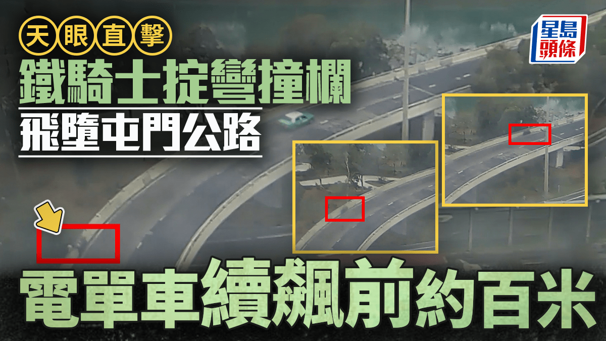天眼直擊|驚悚畫面曝光!鐵騎士屯門公路掟彎失控 飛出欄邊墮橋亡 電單車續飆前約百米
