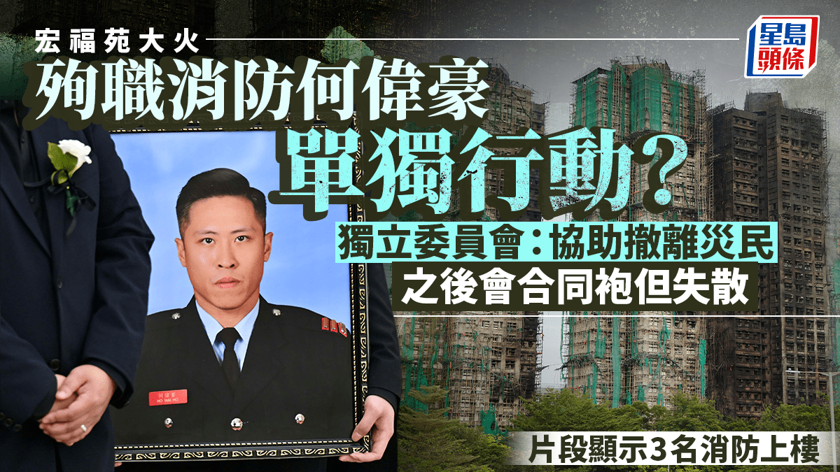 宏福苑大火當日,消防隊目(追授)何偉豪不幸殉職。大埔宏福苑火災獨立委員會聽證會上,代表獨立委員會的資深大律師杜淦堃昨日透露何偉豪殉職經過,指何偉豪原定任務是前往宏昌閣2701室,但最終誤進宏泰閣,其後何偉豪曾發出求救信號,推斷他在31樓試圖打破窗戶逃生,但最終不幸從高處墮下。 對於何偉豪是否單獨上樓行動,坊間有不同猜測。杜淦堃今日(20日)在第二場聽證會上表示,開案陳詞時間有限,不可能逐一在陳詞中