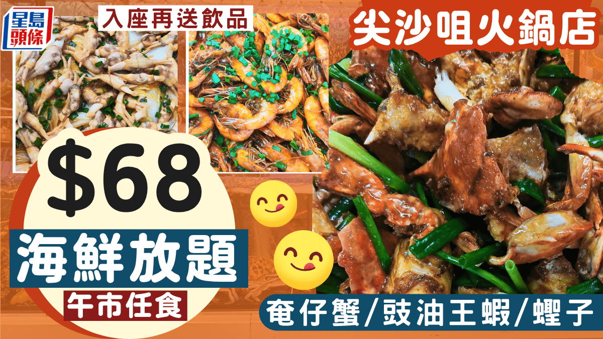 尖沙咀火鍋店$68午市海鮮放題!任食奄仔蟹/豉油王蝦/蟶子 入座送飲品