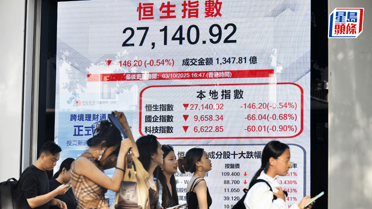 在缺乏北水下,港股三大指數止步連升3日,恒指低開低走,但兩萬七關口失而復得,終收報27140,跌146點。大市成交進一步萎縮,降至1348億元,為5月2日以來最低。大摩發表報告指,9月份淨流入中國股市的外資達46億美元,為2024年11月以來單月最高,主要由被動型基金推動。