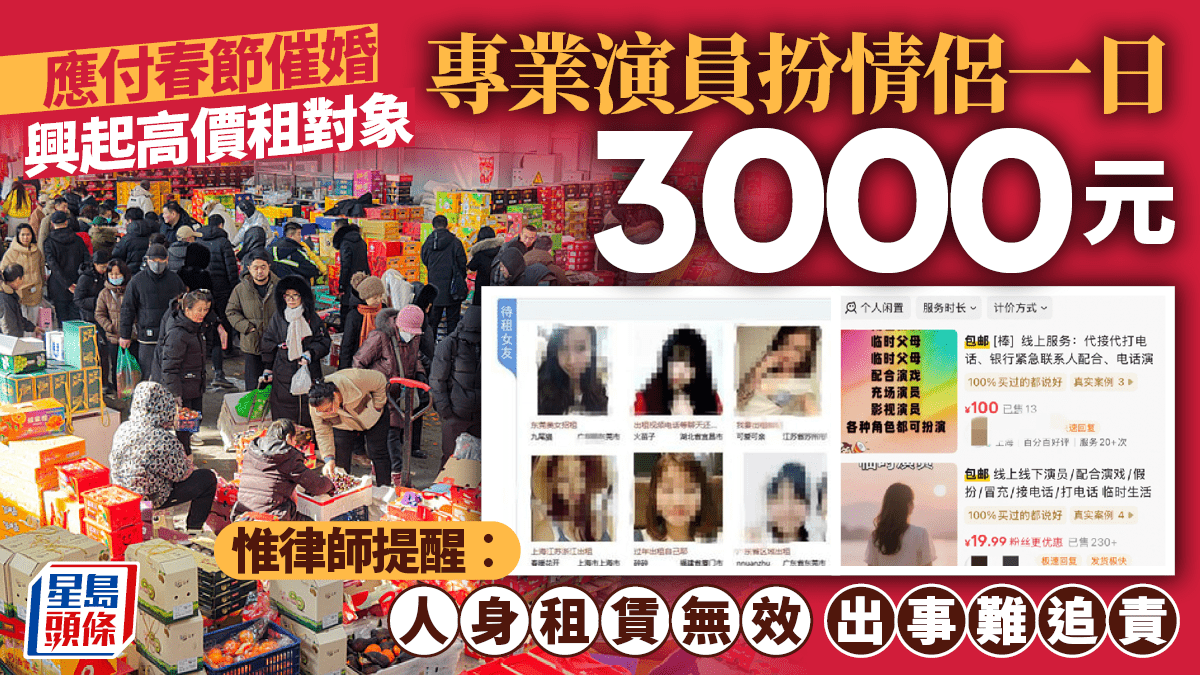 應付春節催婚 興起高價租對象 專業演員扮情侶一日3000元 惟律師提醒︰人身租賃無效 出事難追