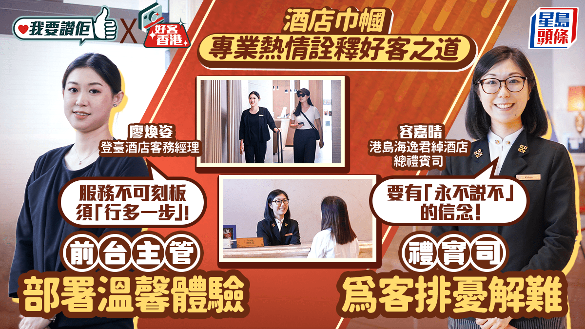 酒店業不僅是旅遊業的門面,更是旅客探索城市的第一站。港島海逸君綽酒店的總禮賓司容嘉晴(Kathryn),化身「萬能鑰匙」助住客處理各種棘手事務,從追蹤失物到充當文化嚮導,從不言倦;登臺酒店客務經理廖煥姿(Cherry)則坐鎮前台,宛若酒店的「核心樞紐」,為客人設計獨特行程,又與旅客締結深厚情誼。旅客踏足酒店一刻起,她們已準備好令客人感受香港的好客精神。