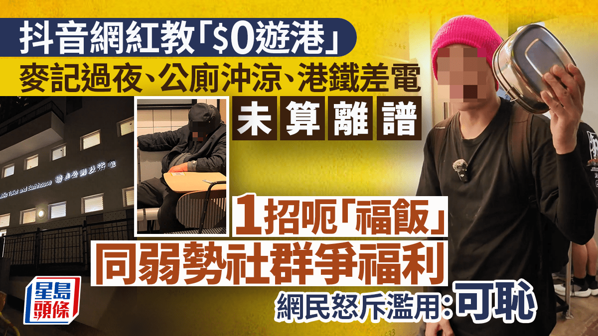 香港物價高,不少旅客選擇「窮遊」方式遊港節省開銷,最近有抖音網紅拍片分享「$0遊港」攻略,教網民如何利用公共資源零消費在香港度過1天,當中麥當勞過夜未算離譜,更教用1招用盡弱勢社群福利 ,影片引發網民熱議及強烈不滿,斥其行為「可恥」!