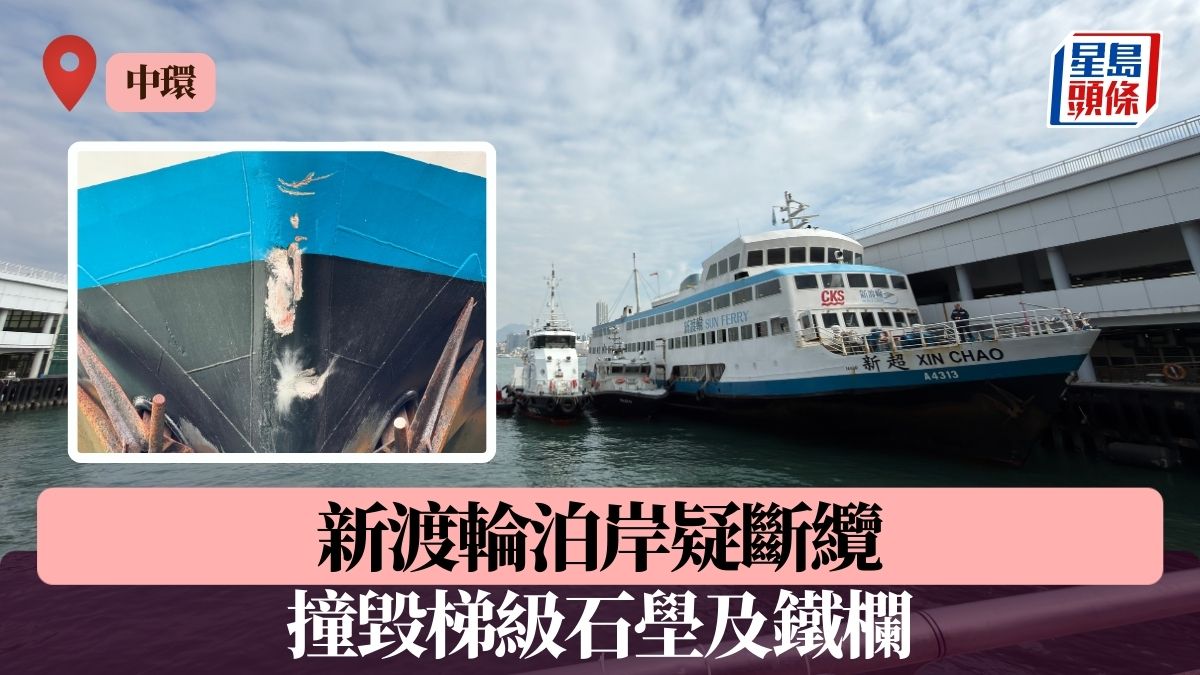 新渡輪「新超號」中環碼頭泊岸疑斷纜 撞毀梯級石壆及鐵欄