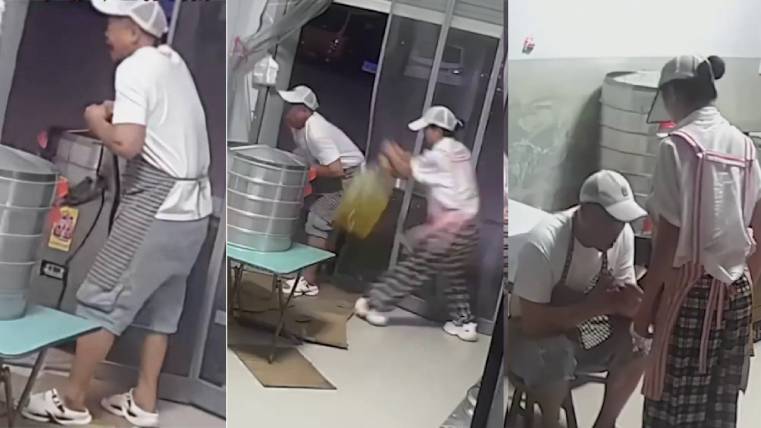 浙江永康一間早餐店近日發生觸電事故:店主在檢查電線時不慎觸電,在千鈞一髮之際,他的妻子拿起油桶猛砸電線,成功將他從死神手中救回。這段看似「突兀」的救援影片曝光後,網友一面倒狂讚:「這桶砸得太及時了!」