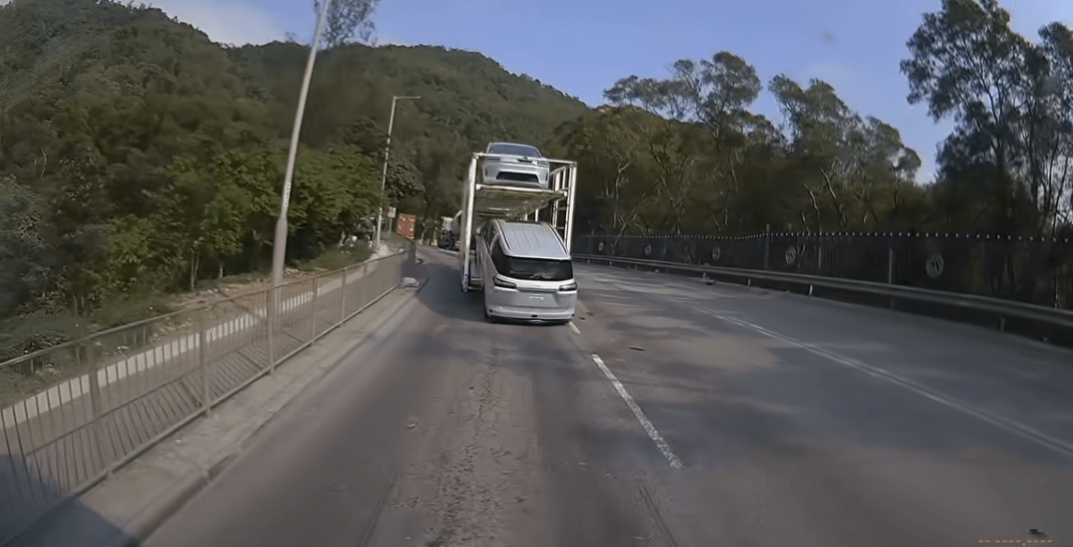 網上瘋傳一段車Cam片段,顯示今日(9日)下午約4時許,一輛載有兩部私家車的雙層運輸車,行經青衣西草灣道、近九巴車廠對開時發生罕見事故。當運輸車在行駛途中收慢再加速時,下層裝載的一輛私家車疑因未妥善固定,突然向後緩緩滑落,幸後車及早察覺,未有造成意外。 新車滑落橫亙路中 網民:「低級錯誤」 從片段可見,涉事私家車向後滑離平台後,在路面搖晃數下最終停在馬路中心,場面極其驚險。片段引起網民熱烈討論,不