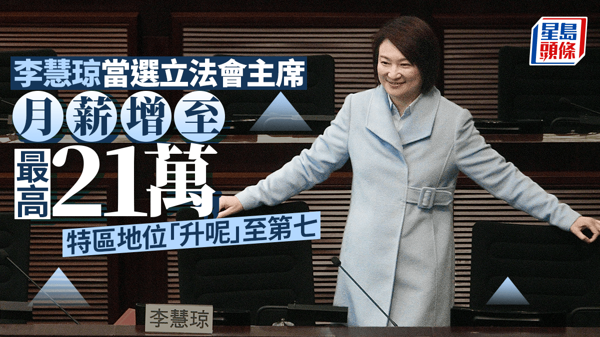 身兼全國人大常委的民建聯李慧琼,以5票之差險勝金融界議員陳振英,成功當選立法會主席,亦是繼民建聯創黨主席曾鈺成後,再有民建聯成員出掌立法會。立法會主席具憲制地位,在特區排名第七,僅次於司長。 享主席辦公室、「LC 1」專用車牌 李慧琼今次成功「升呢」,荷包亦大有進帳,她過去4年擔任內務委員會主席,月薪為163,190元,出任「大主席」後,月薪增至217,580元,即是其他立法會議員月薪108,79