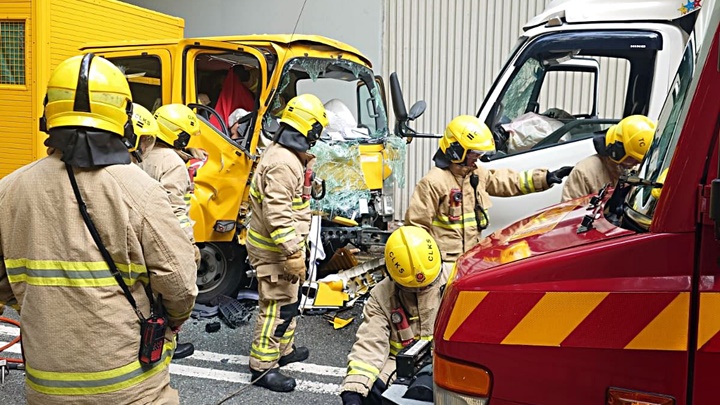 東涌翔東路今(16日)晨10時許發生交通意外,一輛康文署貨車往欣澳道方向行駛,同時另一部貨車往達東路方向卻懷疑逆線行駛。其後兩貨車迎頭相撞,車頭嚴重損毀。康文署貨車司機一度被困,消防接報到場,用工具將司機救出。