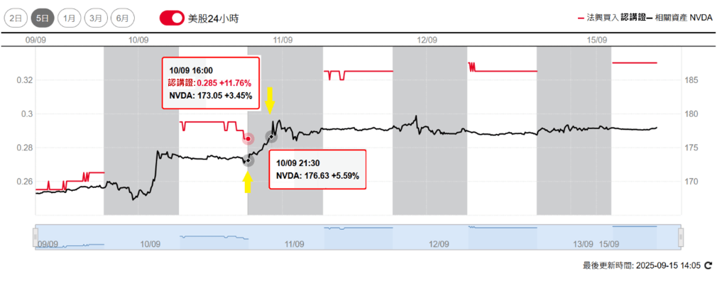 下圖展示投資者如何把握港股交易時段的機會,利用輝達(NVDA)認購證提前布局,提高潛在投資回報的例子。圖中黑色線為輝達(NVDA)24小時的股價表現,紅色線則為輝達認購證在港股交易時段的表現。在9月10日香港時間早上,輝達(NVDA)於其公司網站宣布2026年底推出新一代Rubin CPX芯片系統,消息刺激股價在美國盤後交易時段率先上揚,其後於港股交易時段繼續維持約3.5%升幅。然而,輝達(NVDA)股價在美國盤前升幅進一步擴大,開盤時累積升幅更達5.6%,若投資者能於港股交易時段利用相關認購證提前布局,其潛在回報便比等待美股開盤後才追入多逾2%。