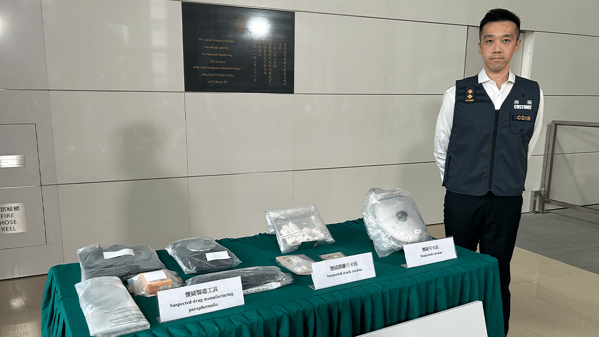 海關人員昨日在葵涌進行反毒品行動,截查兩名形跡可疑的男子,期間在其中一名男子手持的紙袋內檢獲約70克懷疑霹靂可卡因,其後又在另一男子身上檢獲3克懷疑霹靂可卡因,遂將該兩人拘捕。海關人員押解他們到附近一個住宅單位搜查,並再檢獲約2.5公斤懷疑可卡因、220克懷疑霹靂可卡因和一批懷疑製毒工具。