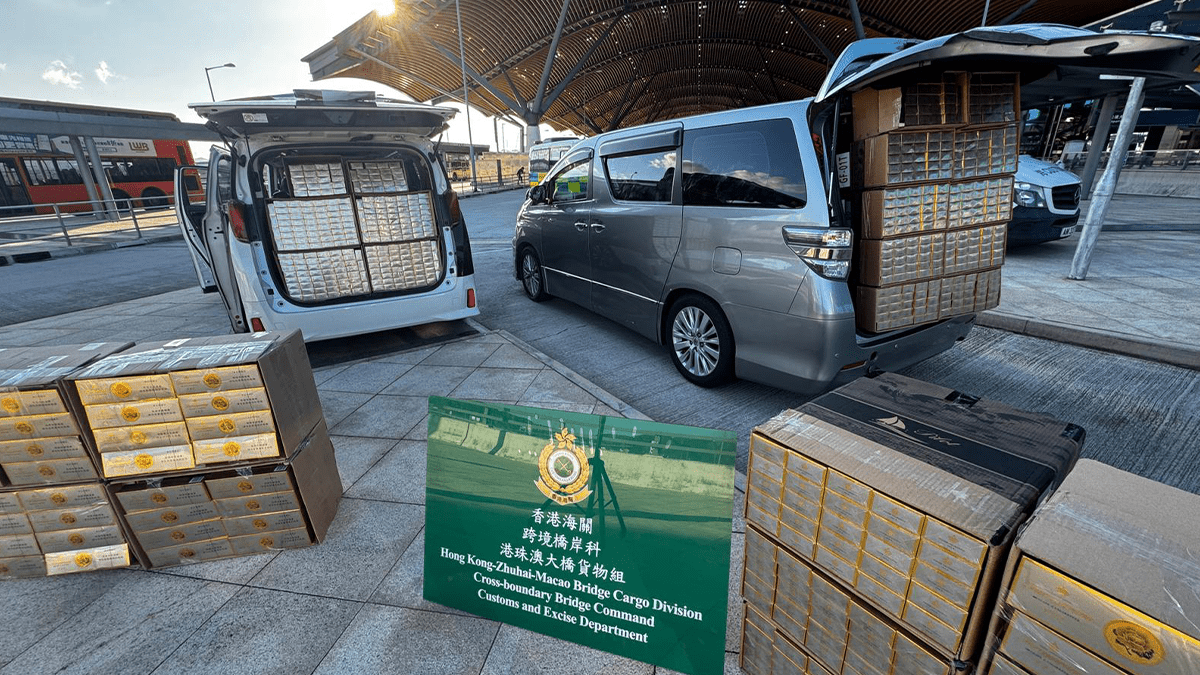海關昨日(13日)與警方新界南交通部執行及管制組於港珠澳大橋香港口岸截查兩輛入境香港的七人車。海關人員在第一輛車內檢獲約13萬支懷疑私煙,分別收藏在車尾箱、後座乘客座位、前座乘客座位底下,部份收藏在暗格。人員隨即拘捕車上的男乘客及男司機,年齡分別為36歲及28歲,報稱為地盤工人及司機。其後海關在第二輛車內檢獲約14萬支懷疑私煙,收藏手法類同,隨即亦拘捕車上的司機及乘客,年齡為51歲及58歲,報稱為司機。