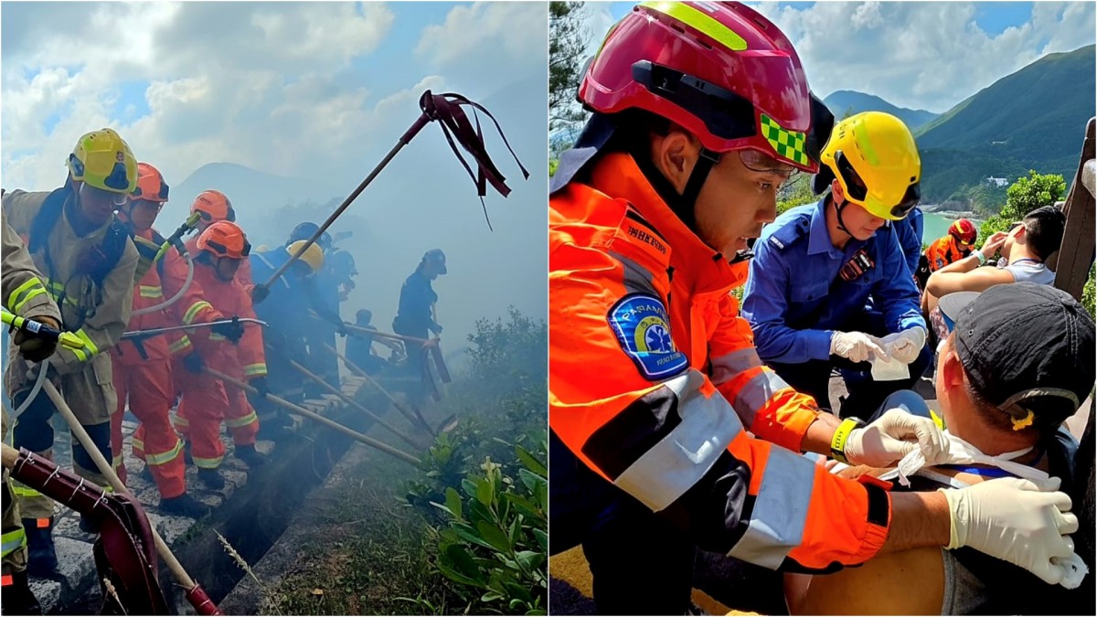 消防處昨日(10月15日)聯同香港警務處、政府飛行服務隊、漁農自然護理署、醫療輔助隊、民眾安全服務隊、民政事務總署、社會福利署及醫院管理局,在大浪灣舉行年度跨部門山火及攀山拯救演習。