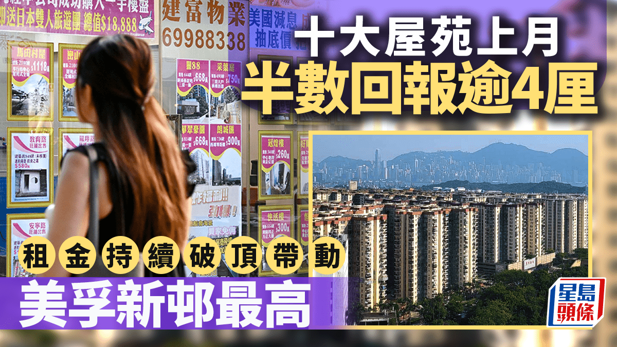 住宅租金破頂帶動回報率持續向上,上月10大屋苑半數回報率超越4厘,其中荔枝角美孚新邨錄最高。