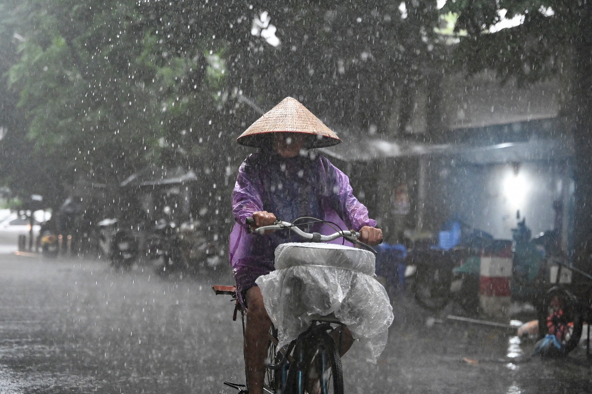 2025年10月7日,受台风“麦德姆”(Matmo)的外围环流影响,越南首都河内出现大范围降雨。图为一名妇女冒雨骑行。(Nhac Nguyen/AFP via Getty Images)