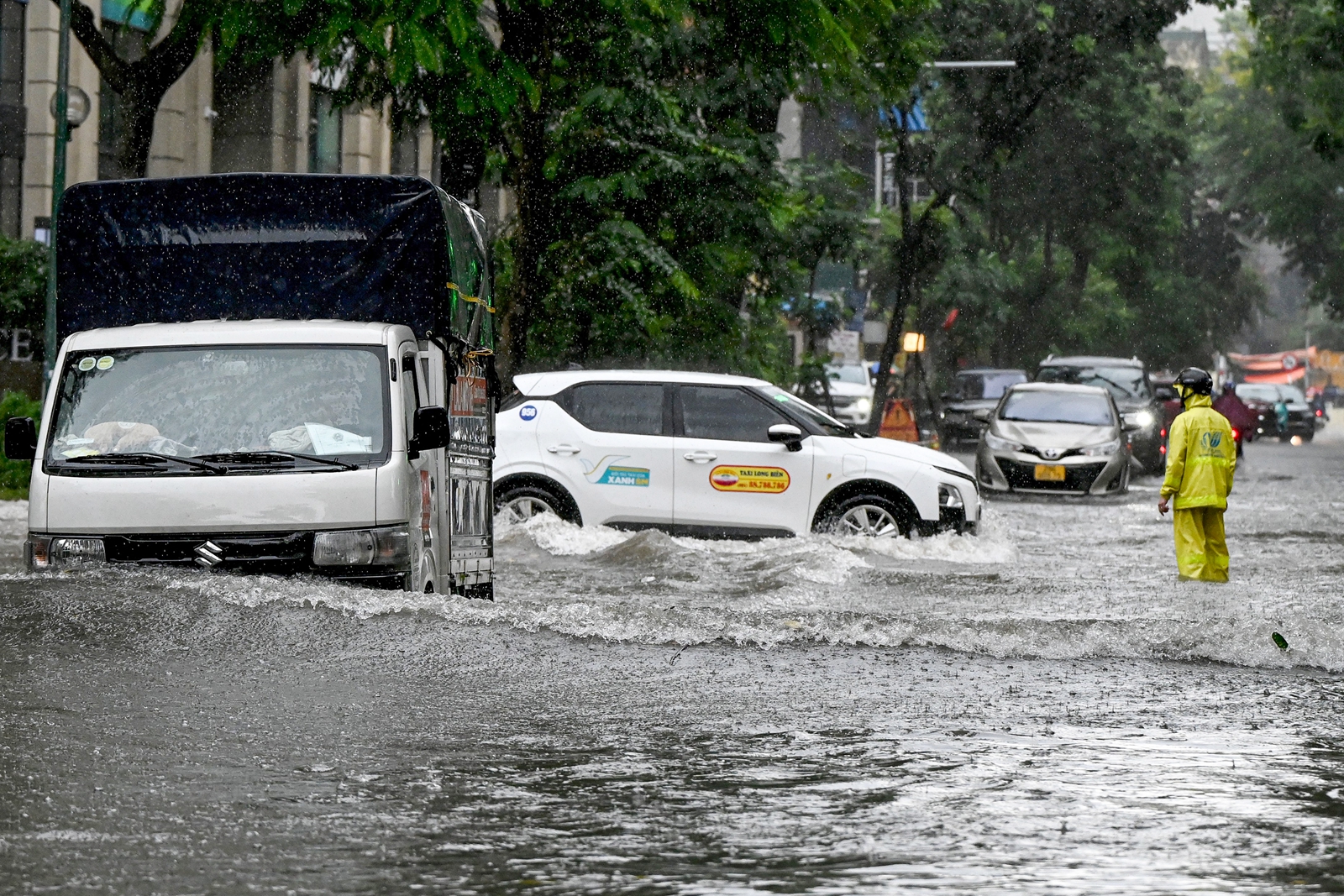 2025年10月7日,受台风“麦德姆”(Matmo)的外围环流影响,越南首都河内出现大范围降雨,图为车辆在积水严重的街道上行驶。(Nhac Nguyen/AFP via Getty Images)