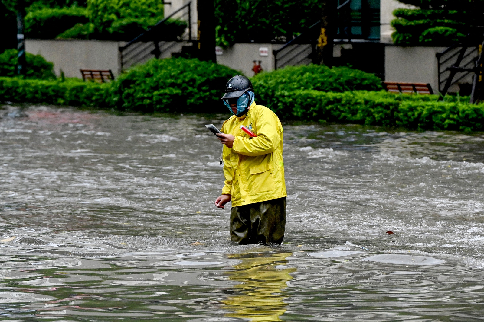 2025年10月7日,受台风“麦德姆”(Matmo)的外围环流影响,越南首都河内出现大范围降雨。图为一名排水工站在被洪水淹没的街道上查看手机。(Nhac Nguyen/AFP via Getty Images)