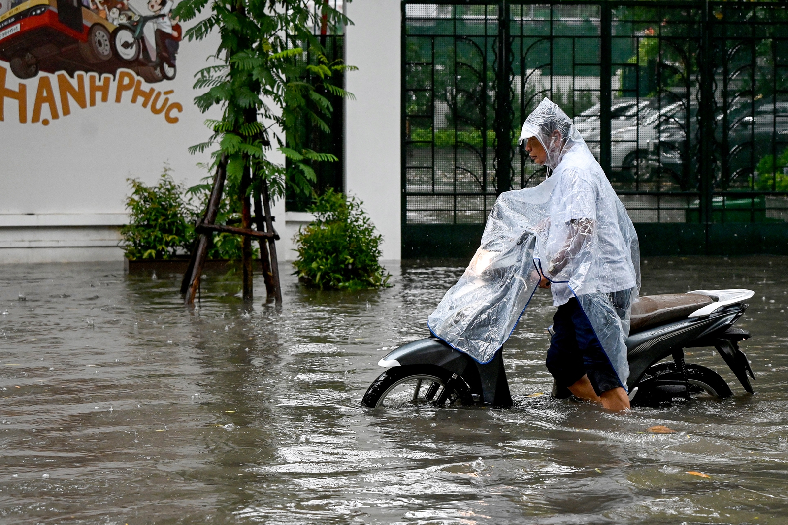 2025年10月7日,受台风“麦德姆”(Matmo)的外围环流影响,越南首都河内出现大范围降雨,民众被迫推着摩托车在水中艰难前行。(Nhac Nguyen/AFP via Getty Images)