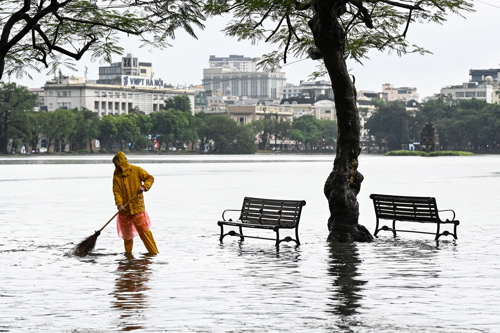 2025年10月7日,受台风“麦德姆”(Matmo)的外围环流影响,越南首都河内出现大范围降雨。图为一名排水工在积水路段进行清理作业。(Nhac Nguyen/AFP via Getty Images)