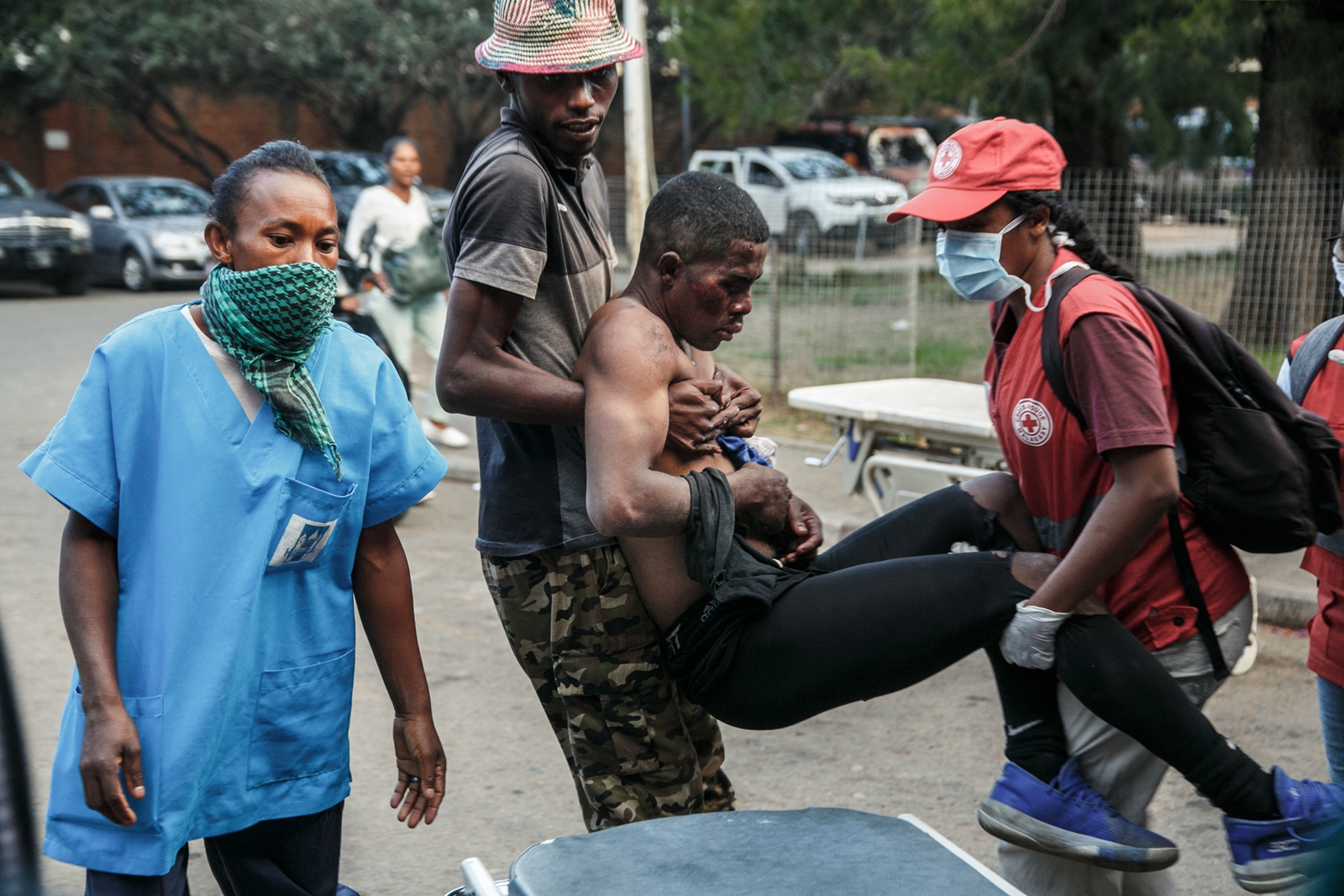 2025年10月11日,马达加斯加首都塔那那利佛,一名抗议者被亲政府安全部队发射的子弹击中后,在现场得到紧急医疗救助。(Rijasolo/AFP via Getty Images)