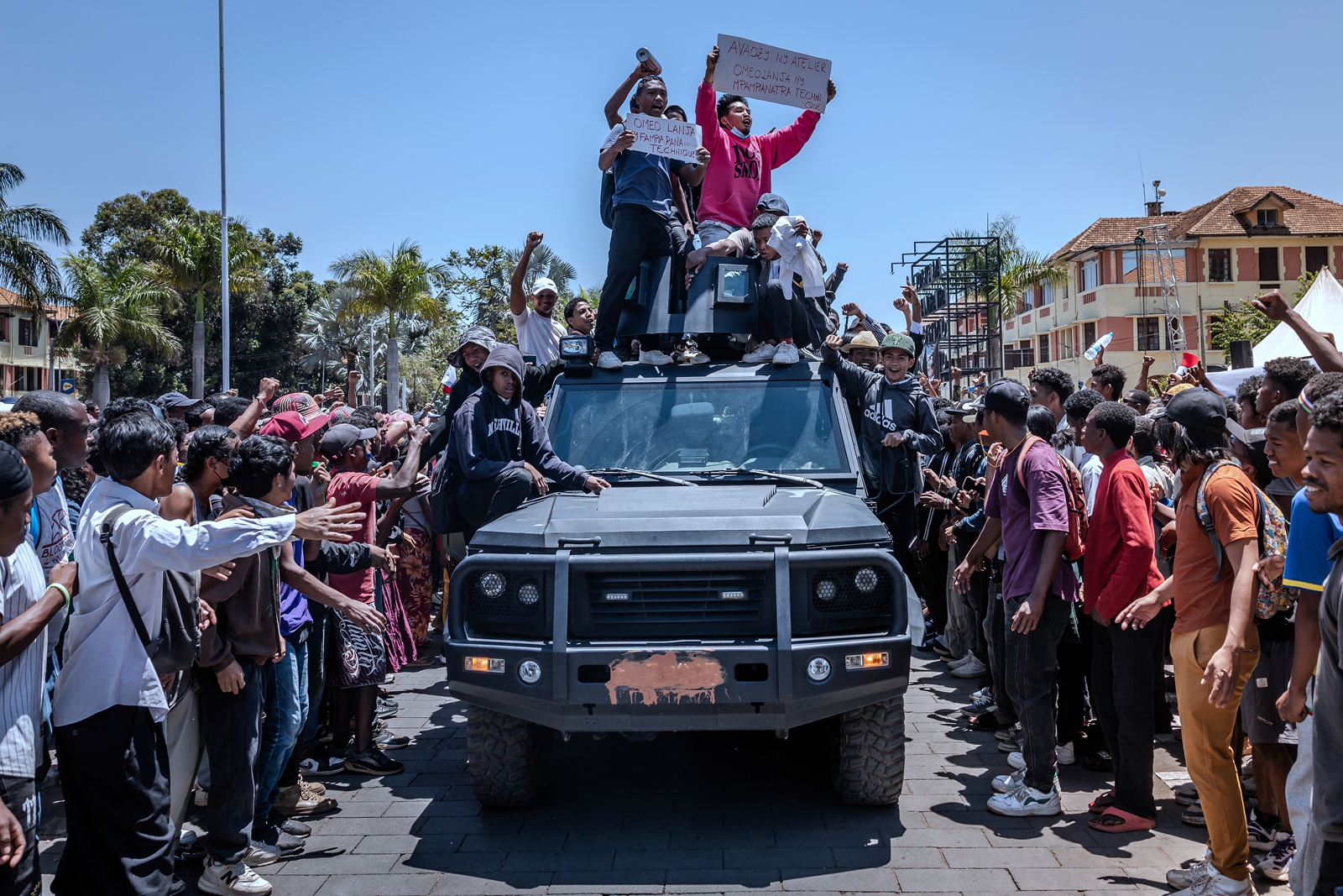 2025年10月11日,数千民众在首都塔那那利佛街头举行抗议活动,要求总统拉乔利纳下台,其间与亲政府安全部队马达加斯加宪兵队成员爆发冲突,抗议者焚烧、砸毁了一辆宪兵装甲车。(Luis Tato/AFP via Getty Images)