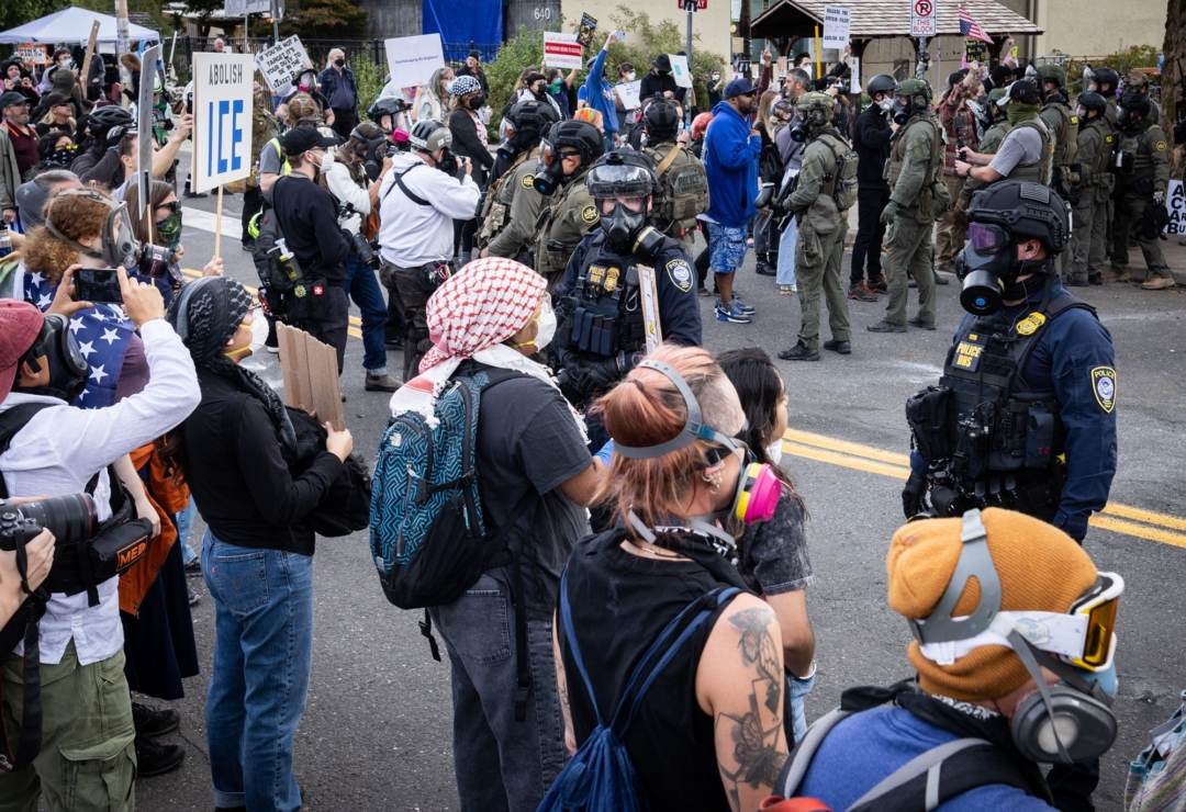 2025年10月3日,大批示威者聚集在俄勒冈州波特兰ICE设施外。(John Fredricks/大纪元)