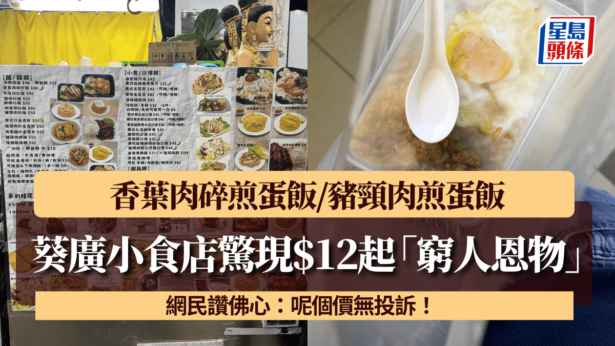 葵廣驚現$12起「窮人恩物」!近日,有港人在社交平台發文,分享位於葵涌廣場的一間泰式小食店,推出最平$12的「特價飯」,有香葉肉碎煎蛋飯及豬頸肉煎蛋飯,份量十足之餘價錢實惠,讓大批網民大讚「佛心」,直言「呢個價無投訴!」即看下文了解詳情。