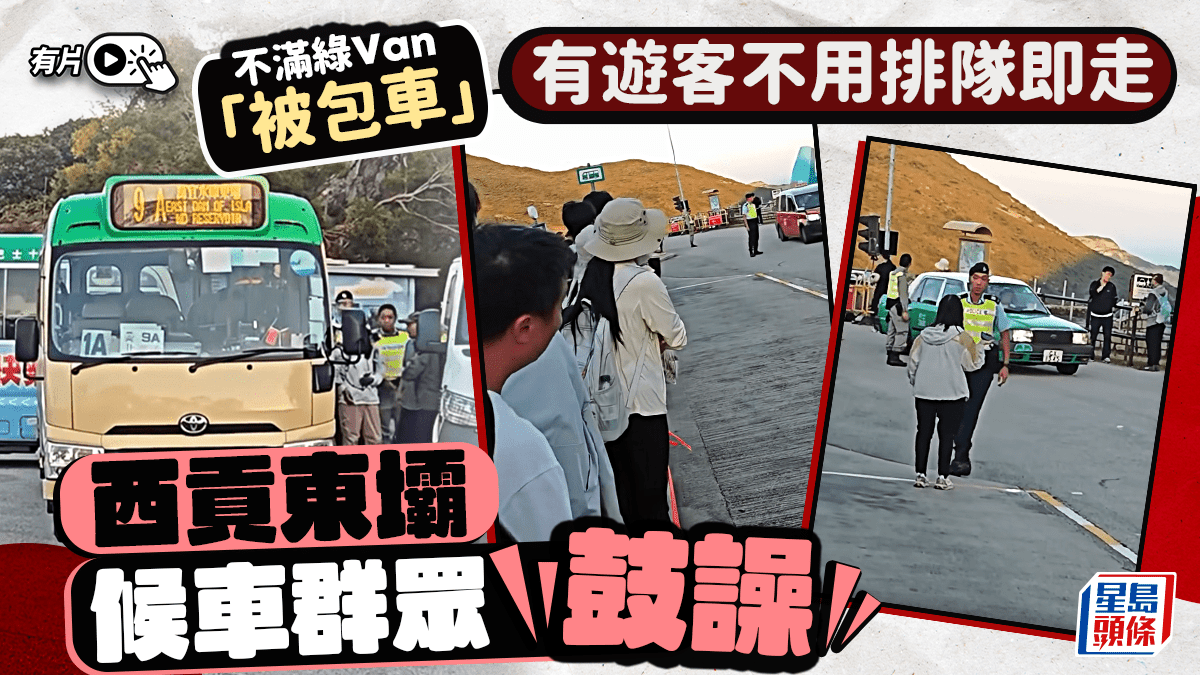 西貢萬宜水庫東壩成為熱門景點,每逢星期六、日及公眾假期,常出現遊客大排長龍等小巴場面,今(9日)網上流出一條短片,片中排隊等小巴的人群鼓譟,只見一群遊客走上對面一輛「9A」小巴,排隊群眾起哄不滿,女子走向在場警員查問,折返即說:「佢(警察)話佢哋包咗車喎。」