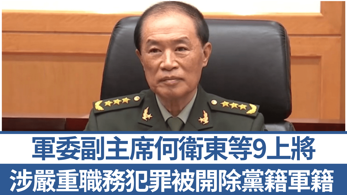 中共四中全會前夕,國防部今日一口氣公布包括中央軍委副主席何衛東等9名解放軍上將落馬被開除黨籍軍籍的消息,指他們涉嫌嚴重職務犯罪,數額特別巨大,性質極為嚴重,影響極其惡劣。這也是身兼中共政治局委員的何衛東神隱大半年後首度被官宣落馬。下周一召開的四中全會將追認相關處分決定。