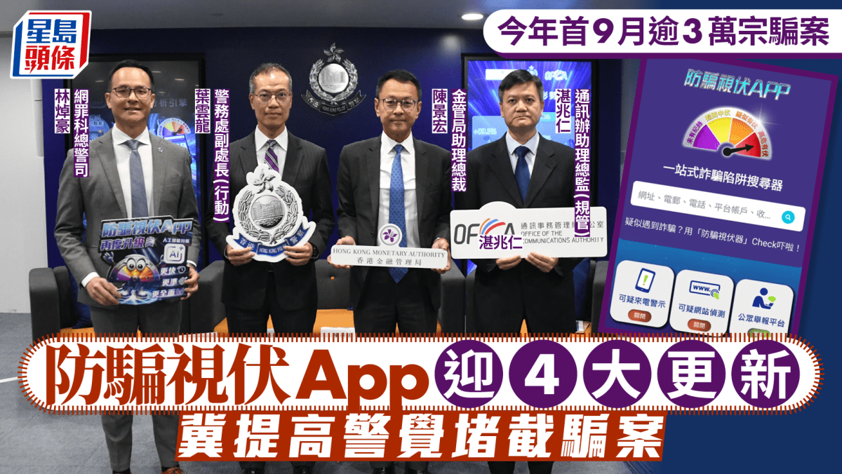 本港於今年1至9月錄得32000多宗詐騙案,比去年同期微升0.1%,當中有受害人墮入深偽技術騙案,被騙財1.45億元。警方為進一步協助市民防範騙案,本月底再升級防騙工具──「防騙視伏器」系列,加入全新人工智能分析引擎,其應用程式「防騙視伏App」亦迎來四大更新,包括即時分析市民的舉報,務求更快捷和精準地利用公眾情報發出詐騙警示,並設立熱門騙局排行榜,列出每日最流行詐騙手法,讓市民提高警覺。