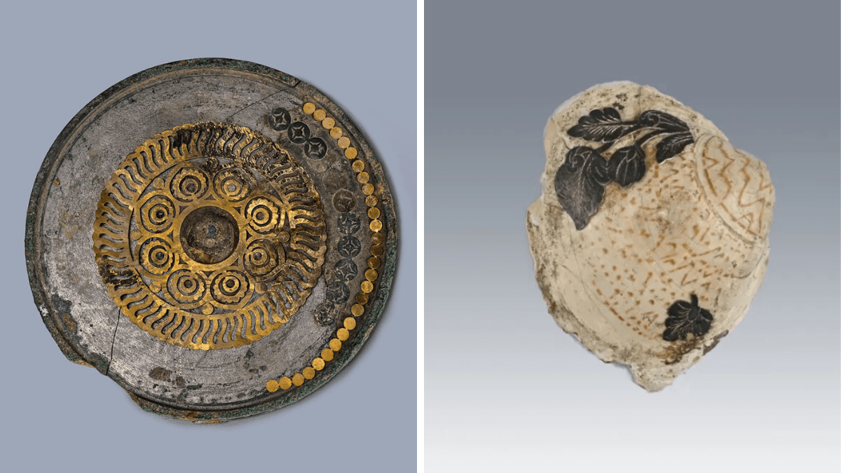 墓葬出土的金銀平脫鏡,直徑15.4厘米、厚0.46厘米,圓形,半球形鈕,圍繞鏡鈕最內層為八瓣心形金片寶相花紋,每瓣為三重,最內重中心處為綠色玻璃珠帶;最外層為一周銀片圓形方孔錢紋和一周金片聯珠紋。