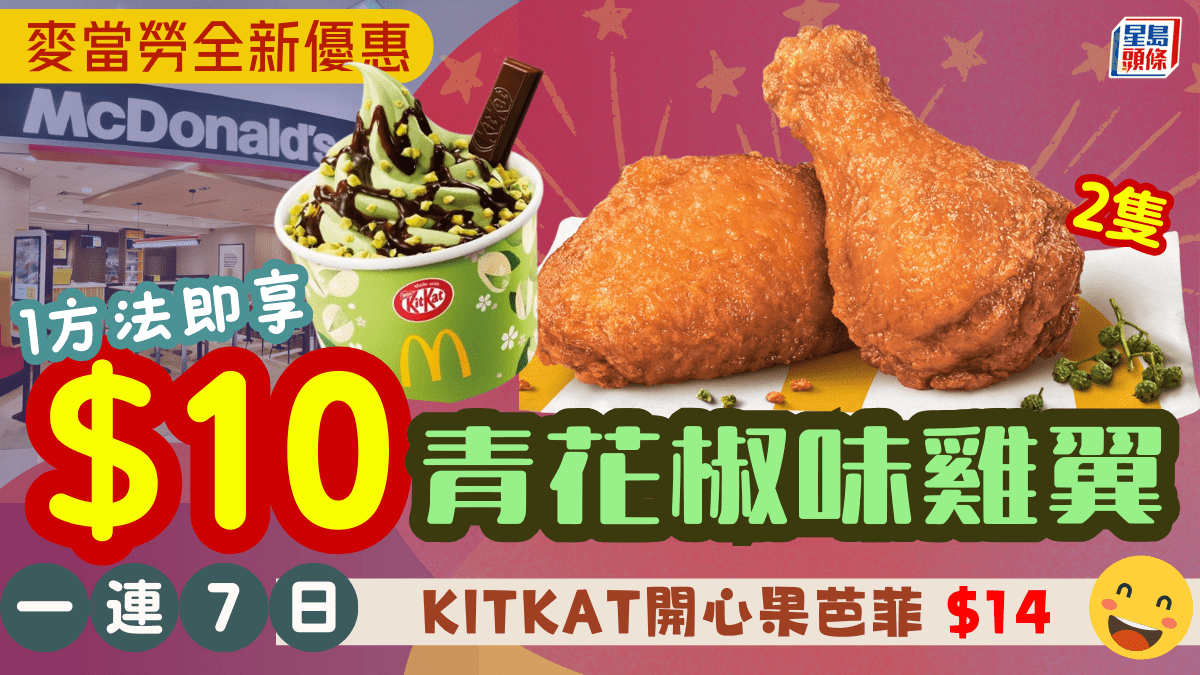 麥當勞全新抵食優惠!$10/2青花椒味雞翼 1方法即享 全新KITKAT 開心果芭菲$14