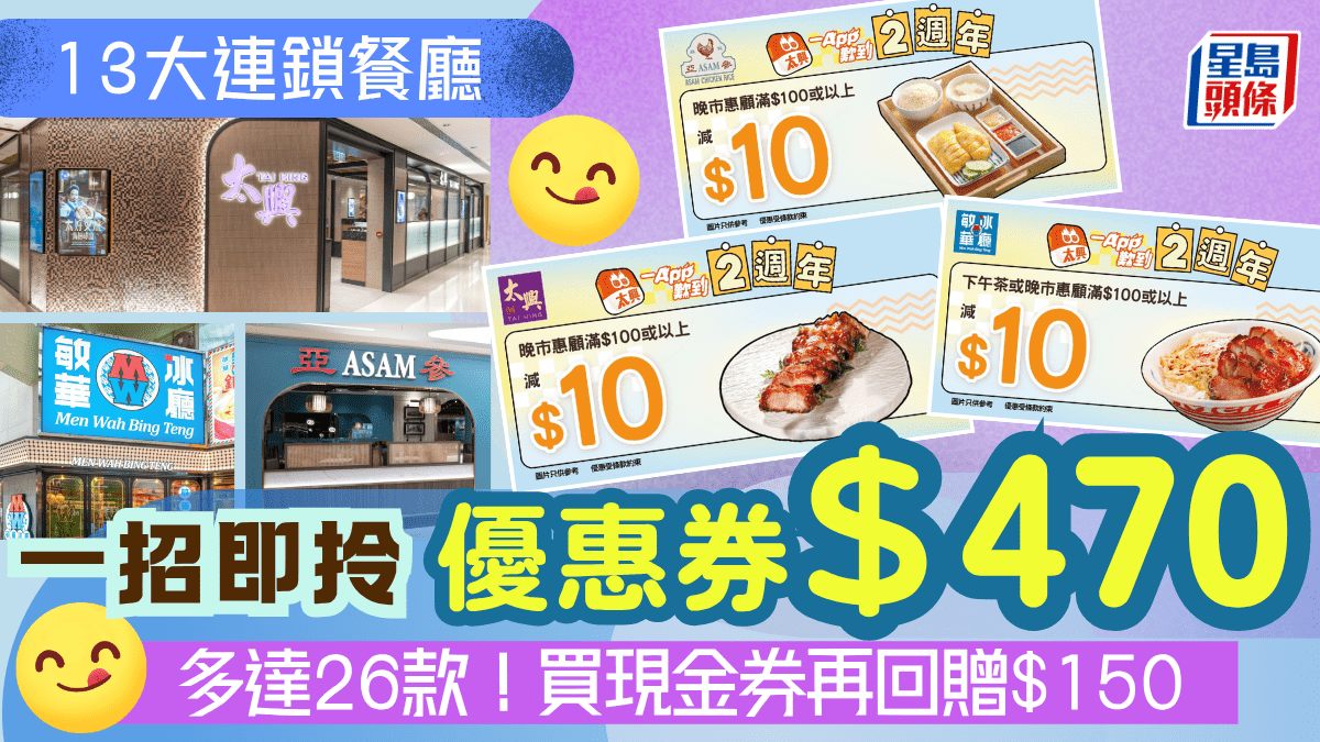 為慶祝太興App推出兩週年,13大連鎖餐廳包括太興、敏華冰廳、茶木、亞參雞飯、靠得住、錦麗、Tommy Yummy、瓊芳冰廳、點煲、Bingle Bingle、餃子駅、滿山.台北 、TOKENYO各分店,將會推出3大優惠連環賞,送高達$470的優惠券。