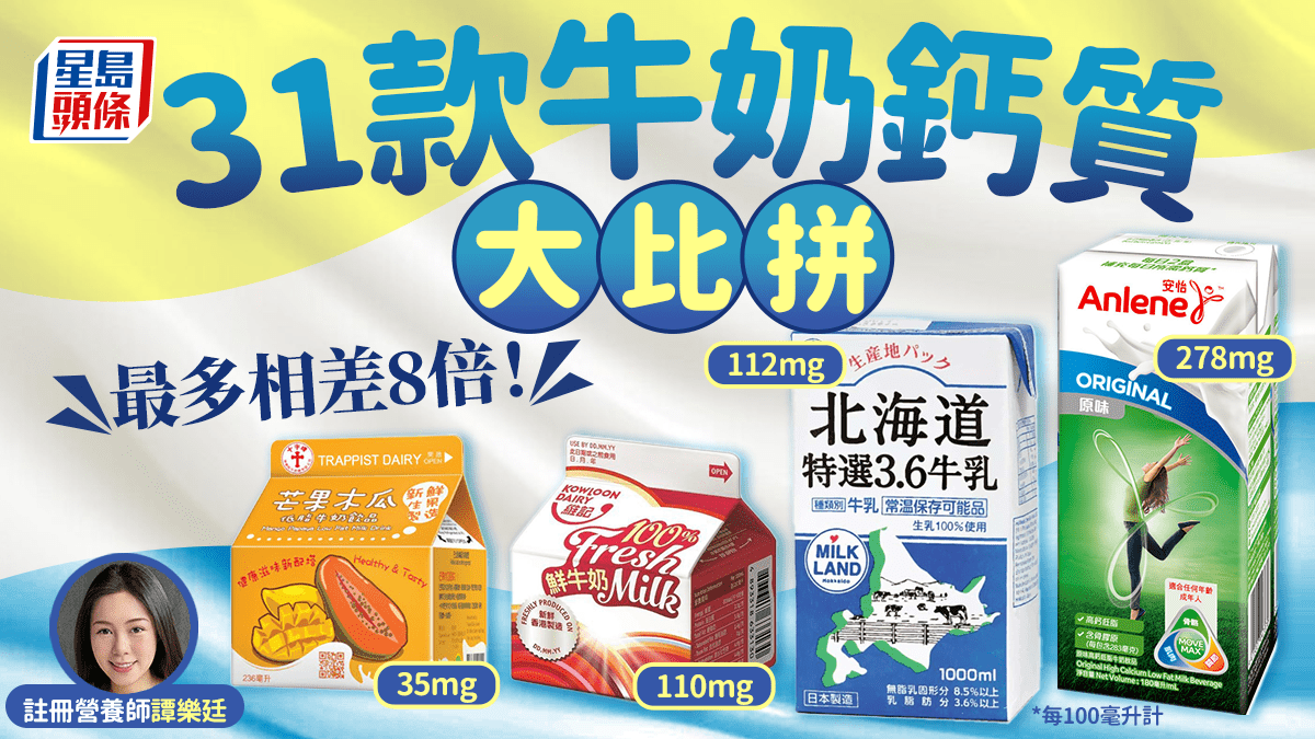 註冊營養師譚樂廷(Audrey)在其instagram發文,列出31款熱門牛奶飲品的鈣質含量,包括脫脂奶、全脂奶、低脂奶及朱古味奶、木瓜奶等其他味道的奶品,以供大家參考。