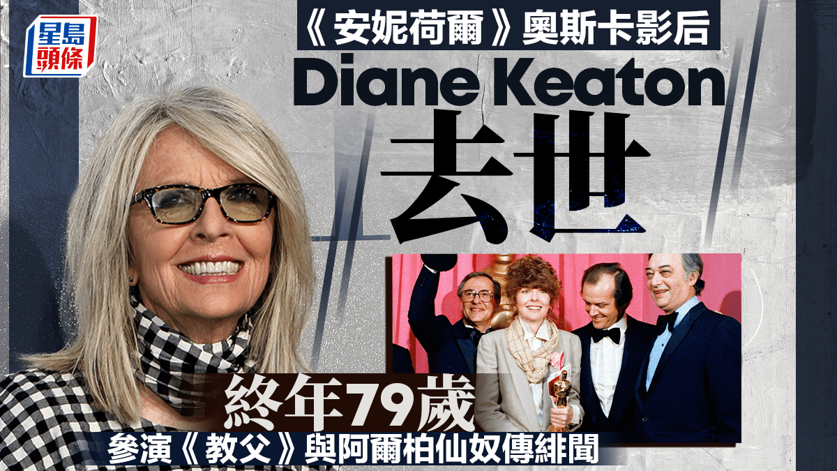 曾演出經典黑幫電影《教父》(The Godfather)的美國荷里活女星戴安姬頓(Diane Keaton)去世,終年79歲。1977年,戴安姬頓憑電影《安妮荷爾》(Annie Hall),奪得奧斯卡最佳女主角,成為全球一線女星。