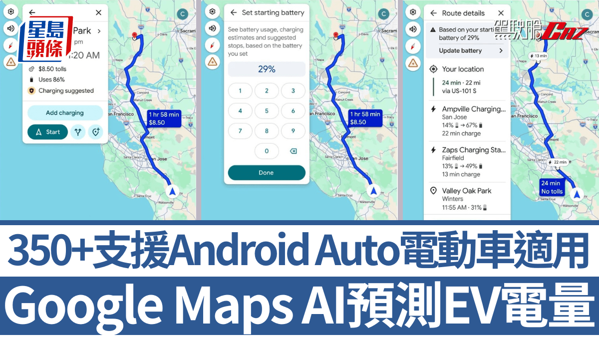 Google Maps AI預測電量規劃導航 逾350款支援Android Auto電動車適用