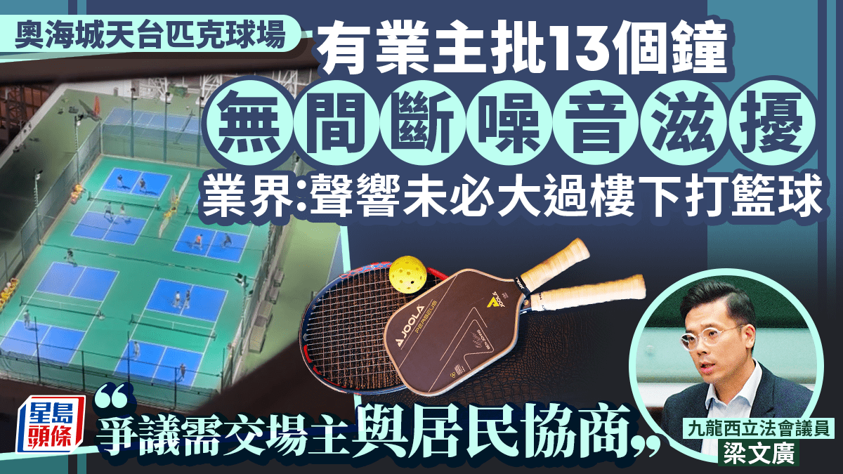 新興運動匹克球(Pickleball)近年在港迅速普及,惟其獨特的擊球聲響,卻逐漸演變成社區噪音爭議。多區居民投訴受匹克球噪音影響,如元朗御豪山莊、深水埗富昌邨及馬鞍山錦泰苑等,其中鄰近奧海城的維港灣居民大吐苦水,因住戶與室外匹克球場僅一街之隔,每日需承受長達13小時噪音。有居民向《星島頭條》反映,會所在奧海城一期天台設有匹克球場,且正進行擴建,擔憂日後噪音加倍。有匹克球場地創辦人認為,若地段屬政